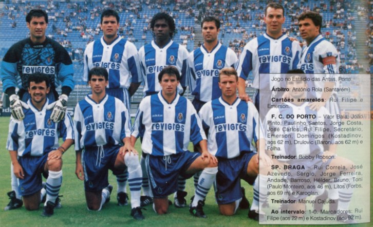 Published 29 de Janeiro de 2024 at 1195 × 729 in Drulovic, “Paulinho” Santos, Domingos, Rui Filipe, Folha, 1º plano; Vítor Baía, José Carlos, Emerson, Secretário, Jorge Costa, João Pinto, em pé ← Anterior Seguinte →