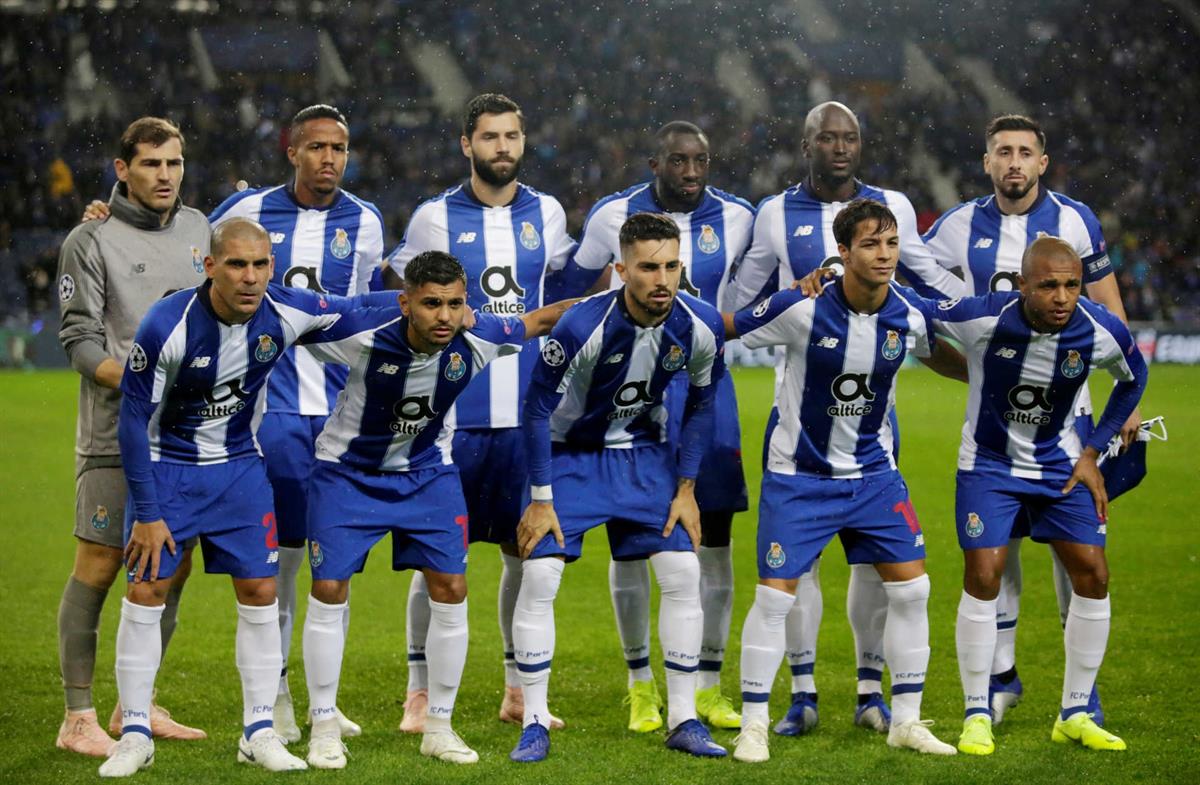 Published 4 de Abril de 2021 at 1200 × 785 in “Maxi” Pereira, Corona, Alex Telles, Óliver Torres, Brahimi, 1º plano; Casillas, Éder Militão, Felipe, Marega, Danilo, Herrera, em pé ← Anterior
